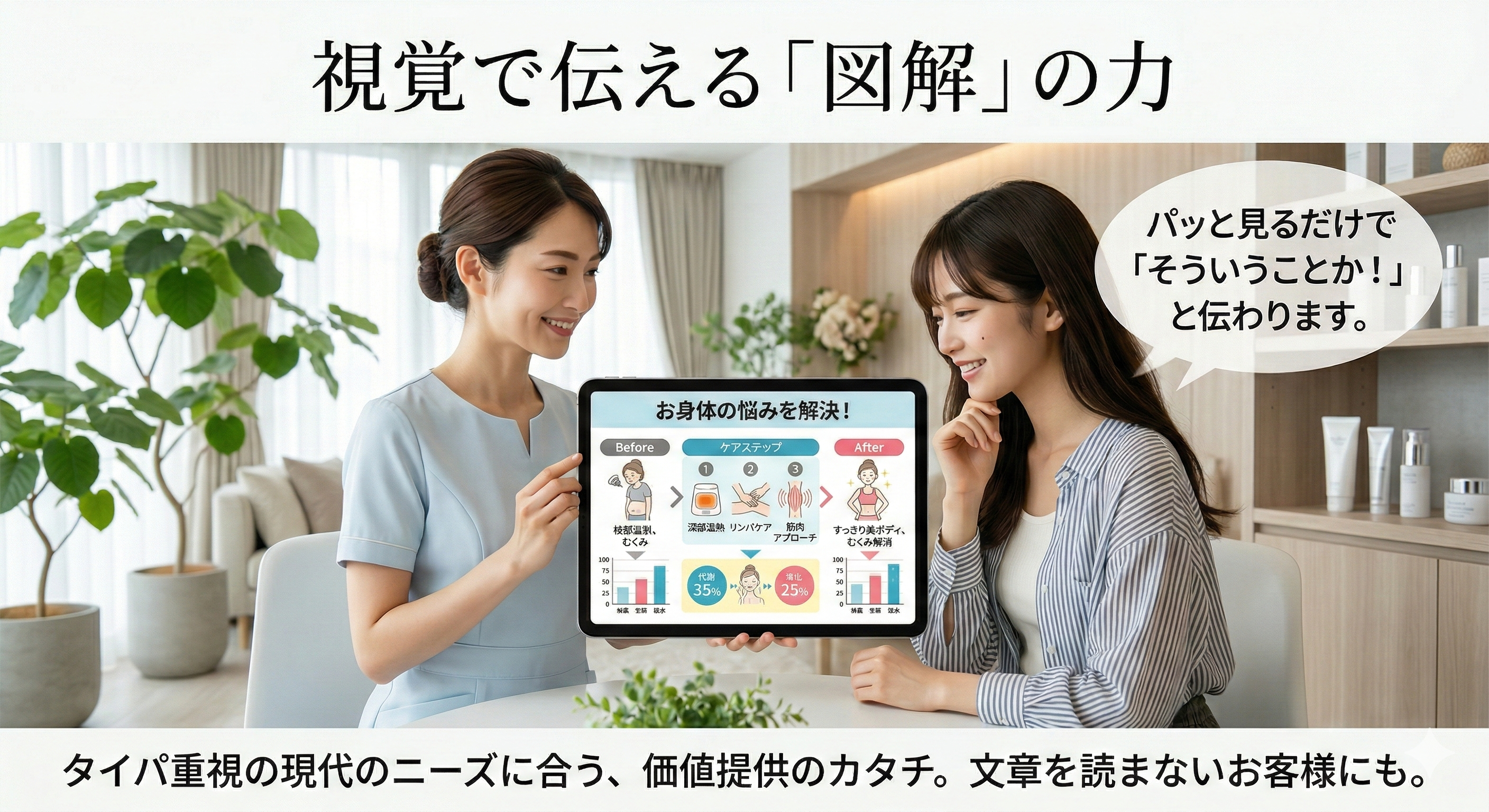 専門知識を精査し、40〜60代女性の心に響く「ぬくもりある言葉」に翻訳。現場を熟知しているからこそ作れる「お客様が本当に動く」内容です。